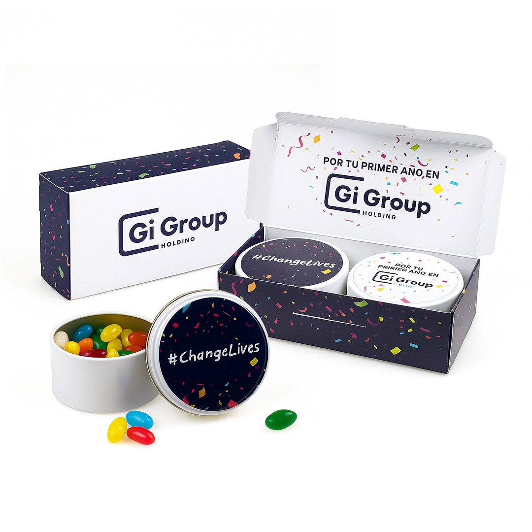 Description: cardboard box with 2/3 cans (Ø70×40 mm) with filling to choose between chocolate rocks, chocolate cereal balls, chocolate almond or pecan. Please consult other fillings.