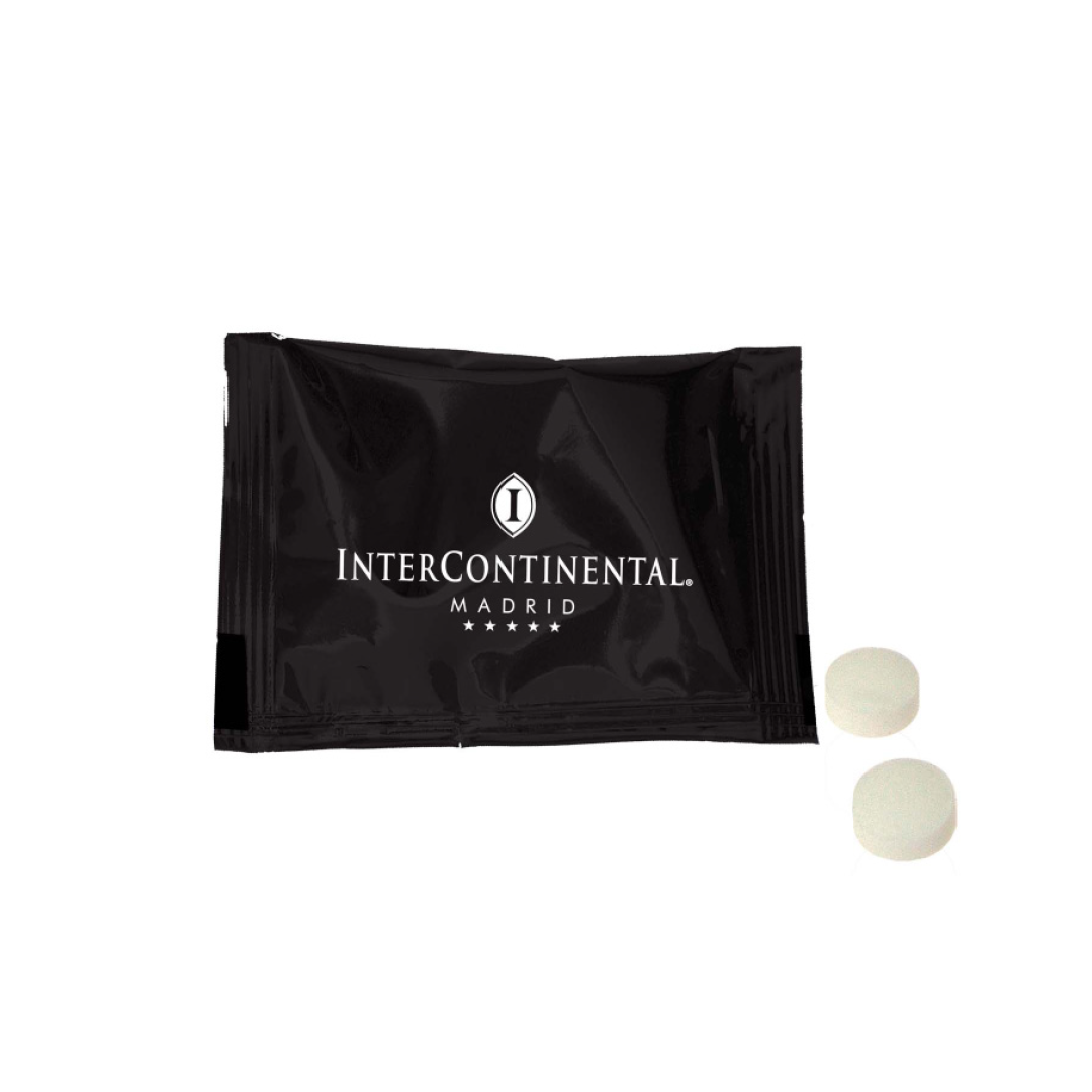 Description: sugar-free mint compressed candies in flow-pack packaging (50×35 mm).