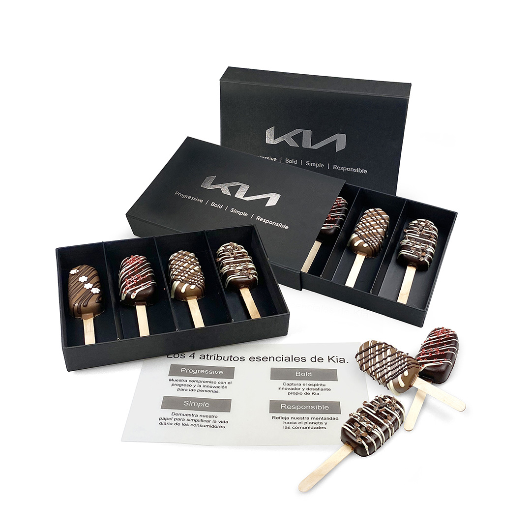 Description: 4 mini popsicle-shaped chocolates (40g) with personalized toppings in a lined hard cardboard box.