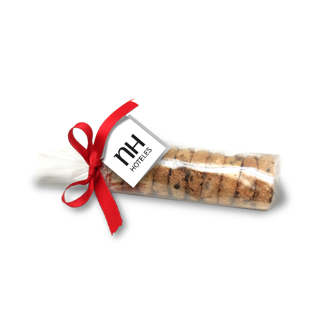 Description: bag (Ø30×150 mm) with personalized banner and bow filled with 10 mini cookies.