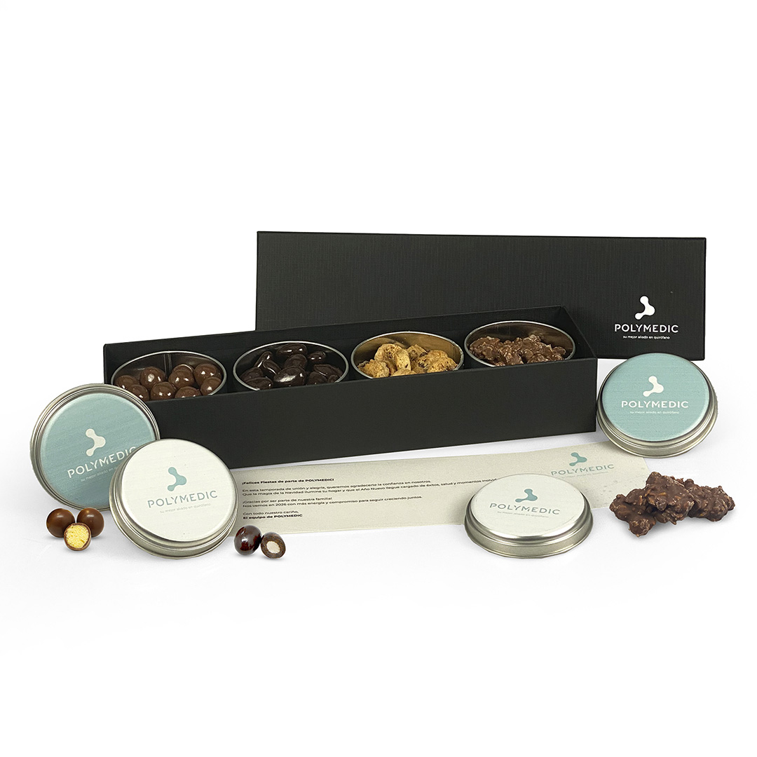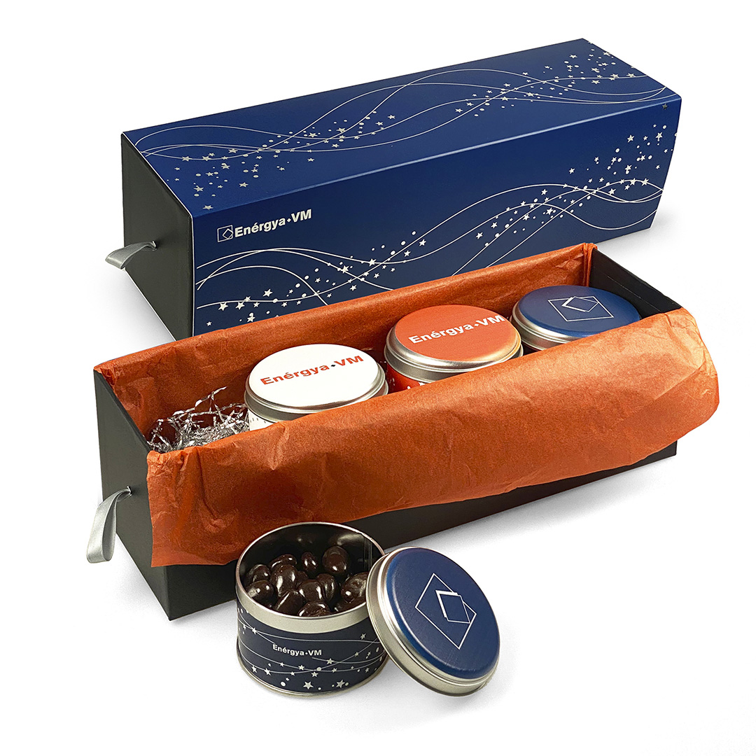 Description: medium rigid cardboard chest (approx. 360x110x110 mm) with full-colour custom branding. We take care of every presentation detail to convey emotion and enhance your brand image with a truly premium look. Contains Swiss chocolate balls (110g), mini cookies (80g), milk chocolate rocks (100g), and chocolate-covered almonds (140g). Accompanied by a greeting card.