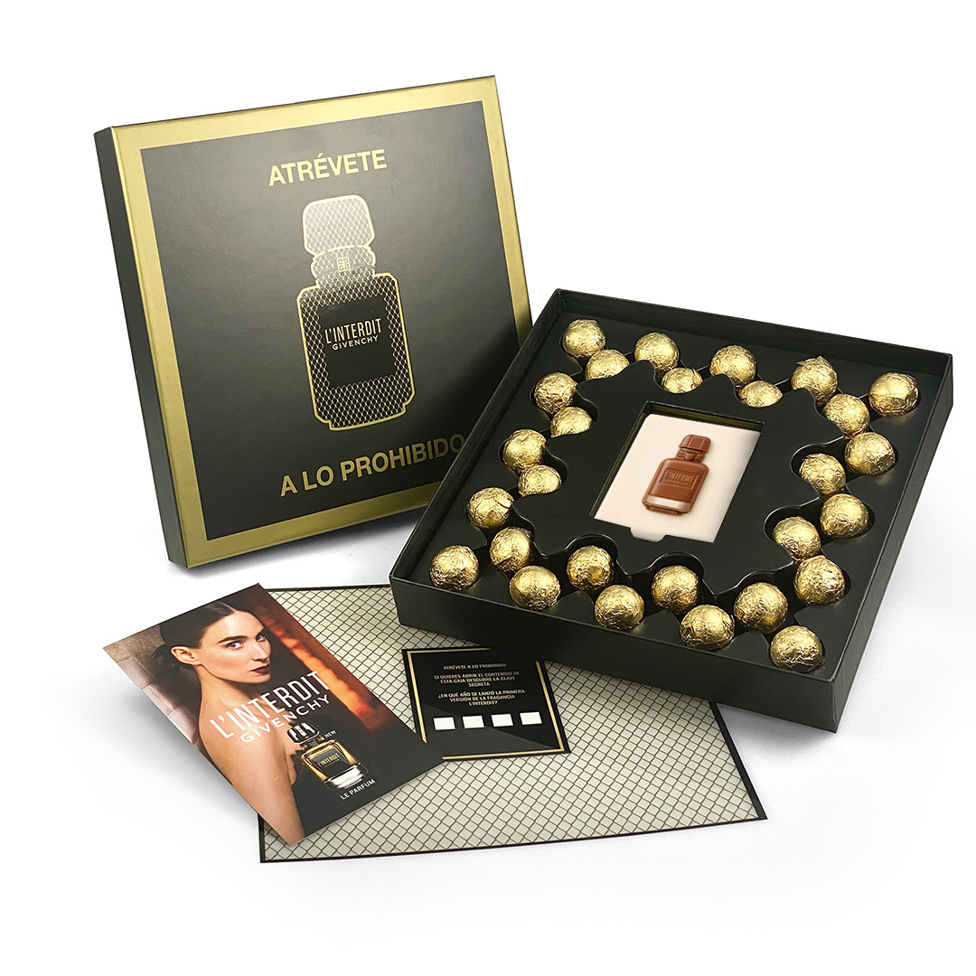 Description: Rigid cardboard box wrapped with paper, containing 28 spherical chocolates wrapped in gold aluminium and one personalized 2D chocolate bar. Includes a card and an acetate sheet.