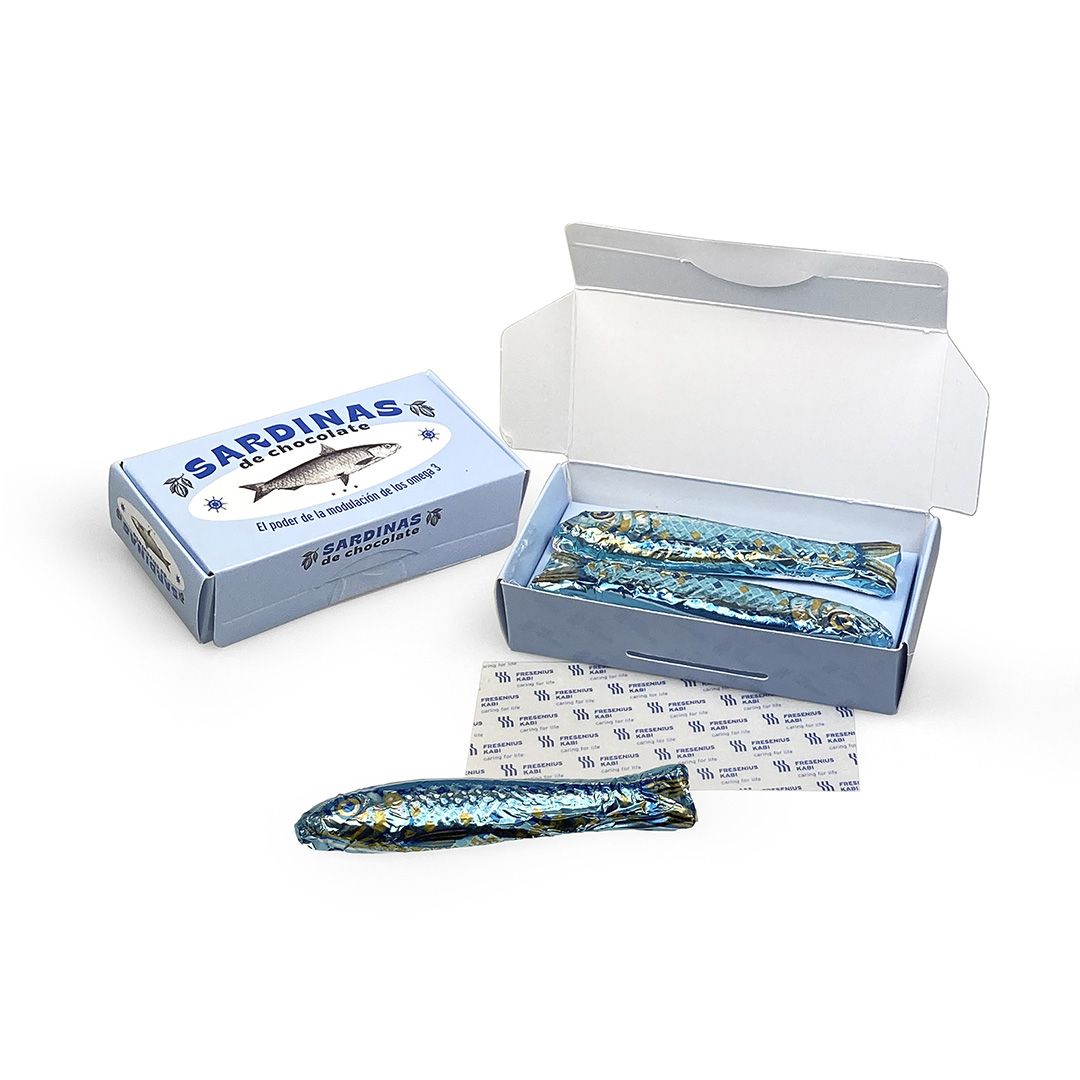 Description: cardboard box with 2 chocolate sardines, wrapped in metallic paper.
