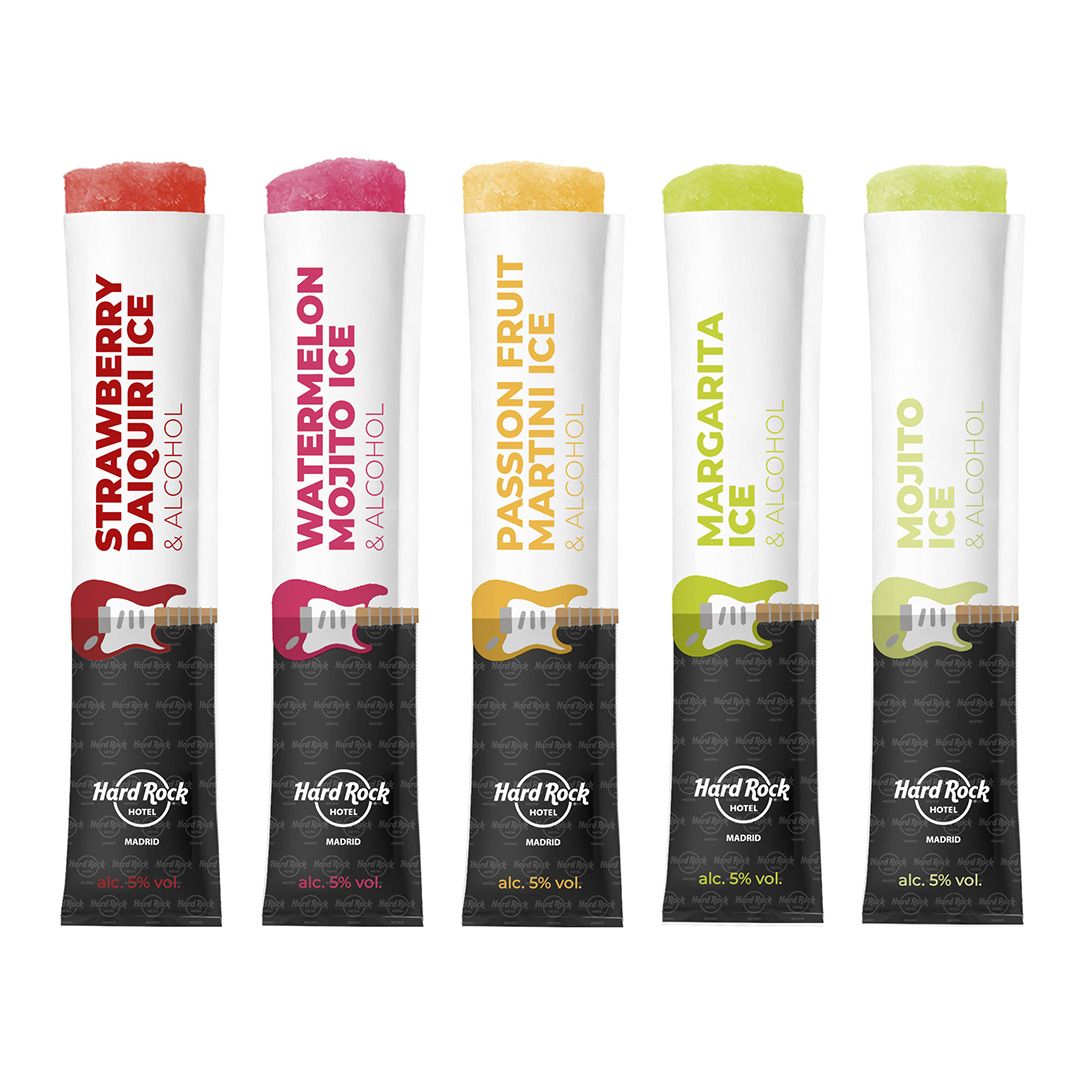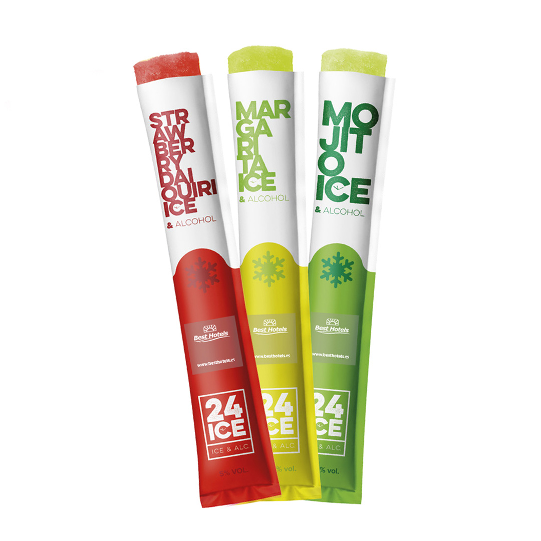 Alcoholic freeze pops in cocktail-inspired flavors: Strawberry Daiquiri, Watermelon Mojito, Passion Fruit Margarita, Margarita and Mojito — a refreshing and distinctive proposal ideal for events, promotions or summer campaigns.