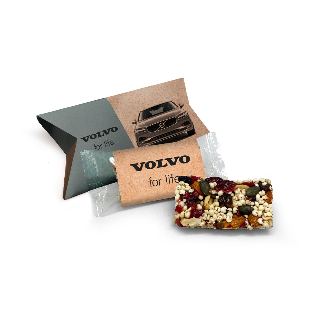 Description: Rectangular cardboard box containing two 25 g energy bars, a compact and practical format designed for promotional campaigns, events or initiatives related to wellbeing and energy.