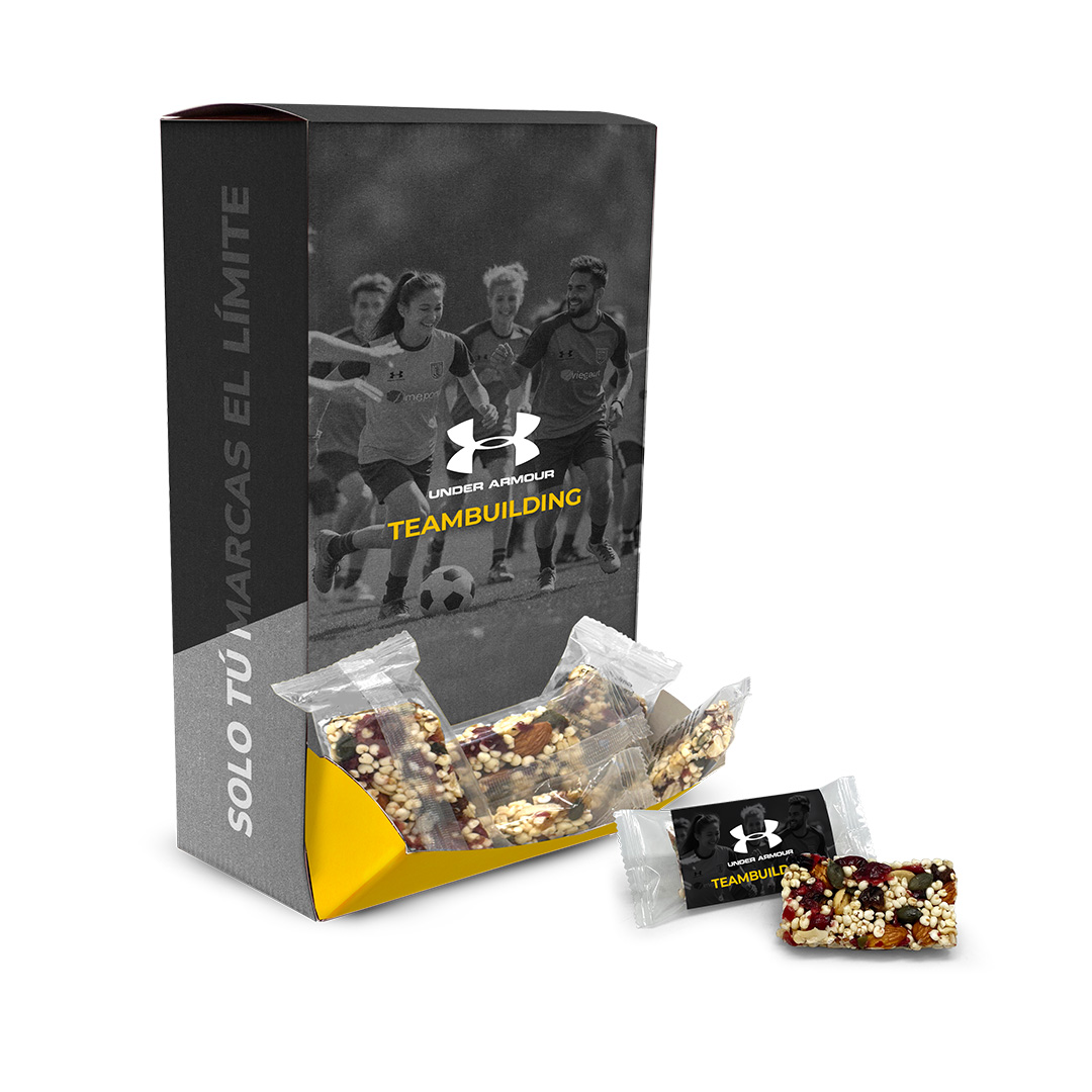 Description: Laminated cardboard dispenser with energy bars, a practical and highly visual format designed for promotional campaigns, sporting events, offices or high-traffic spaces.