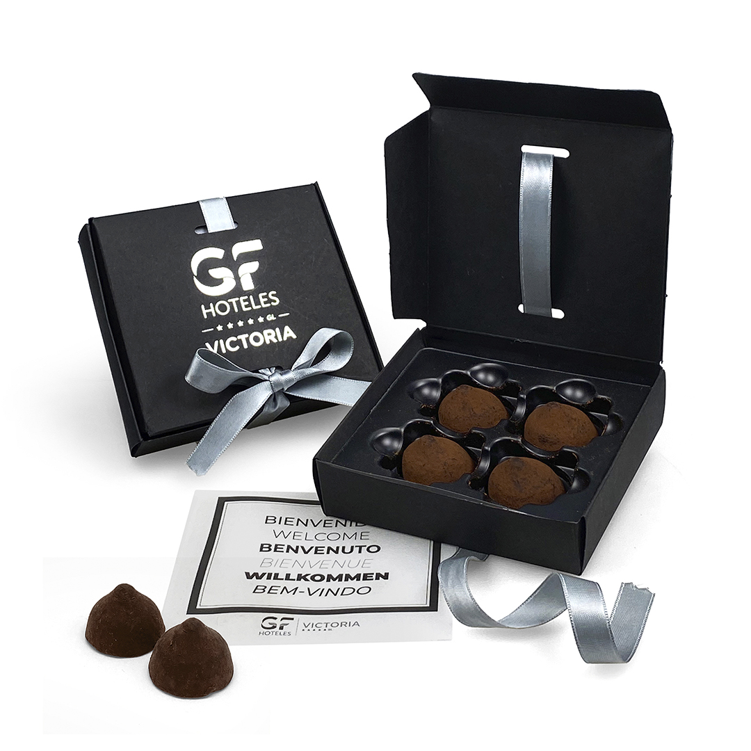 Description: cardboard box with premium truffles, closed with a sleeve and ribbon.