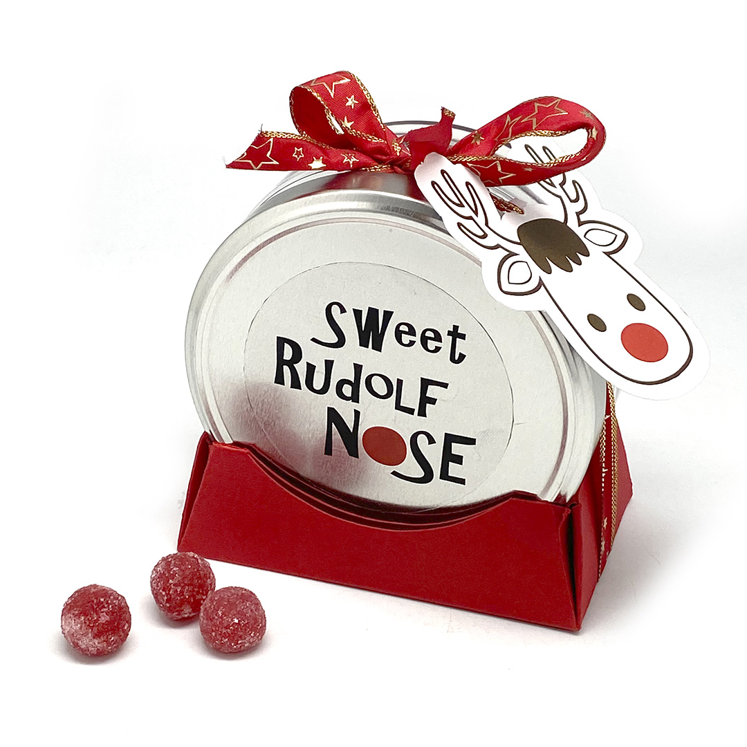 Description: glass jar (Ø115×53 mm) with cherry or watermelon flavored “Santa Claus boot” artisan candies. Presented on a cardboard or box base.
