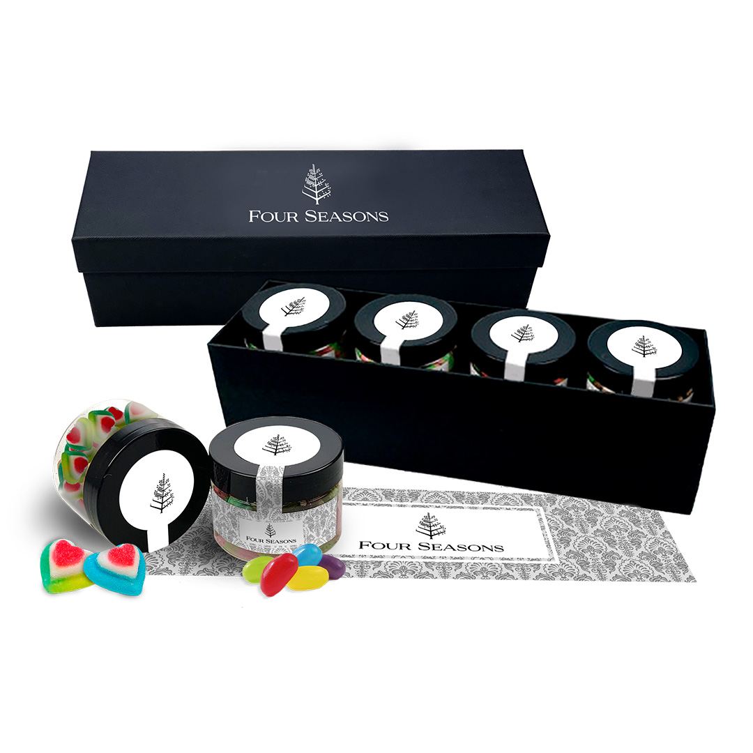 Description: 4 jars of 150 ml filled with a wide variety of candies. Presented in a rigid cardboard box.