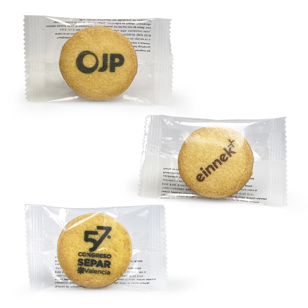 Description: butter cookie (Ø50 mm approx.) with direct printing on the cookie itself, packaged in flowpack.