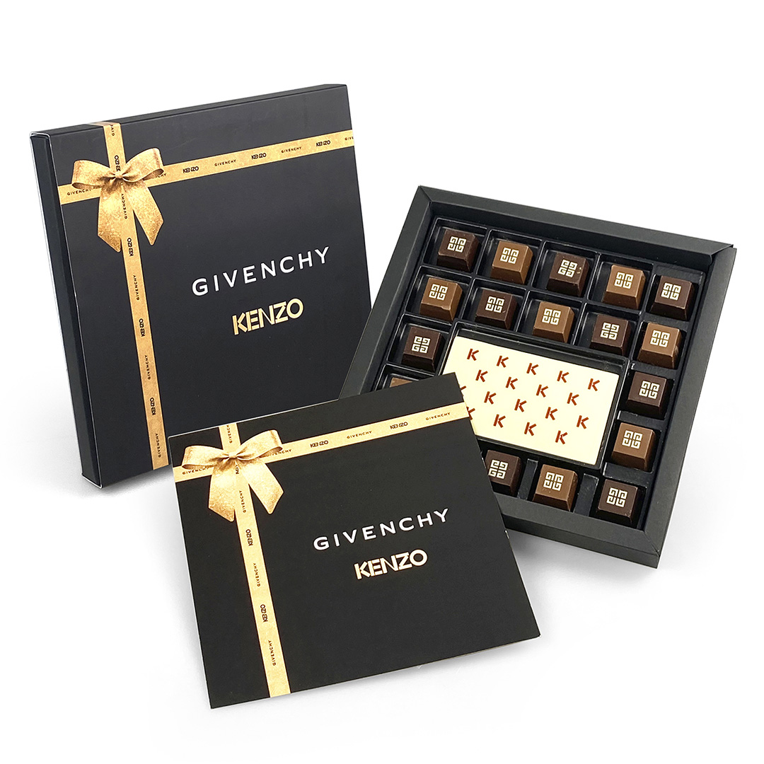 Description: folding box with cover and card. Contains 9 pyramid chocolates, 9 artisan chocolates and a personalized chocolate bar. Consult the possibility of choosing the chocolates.