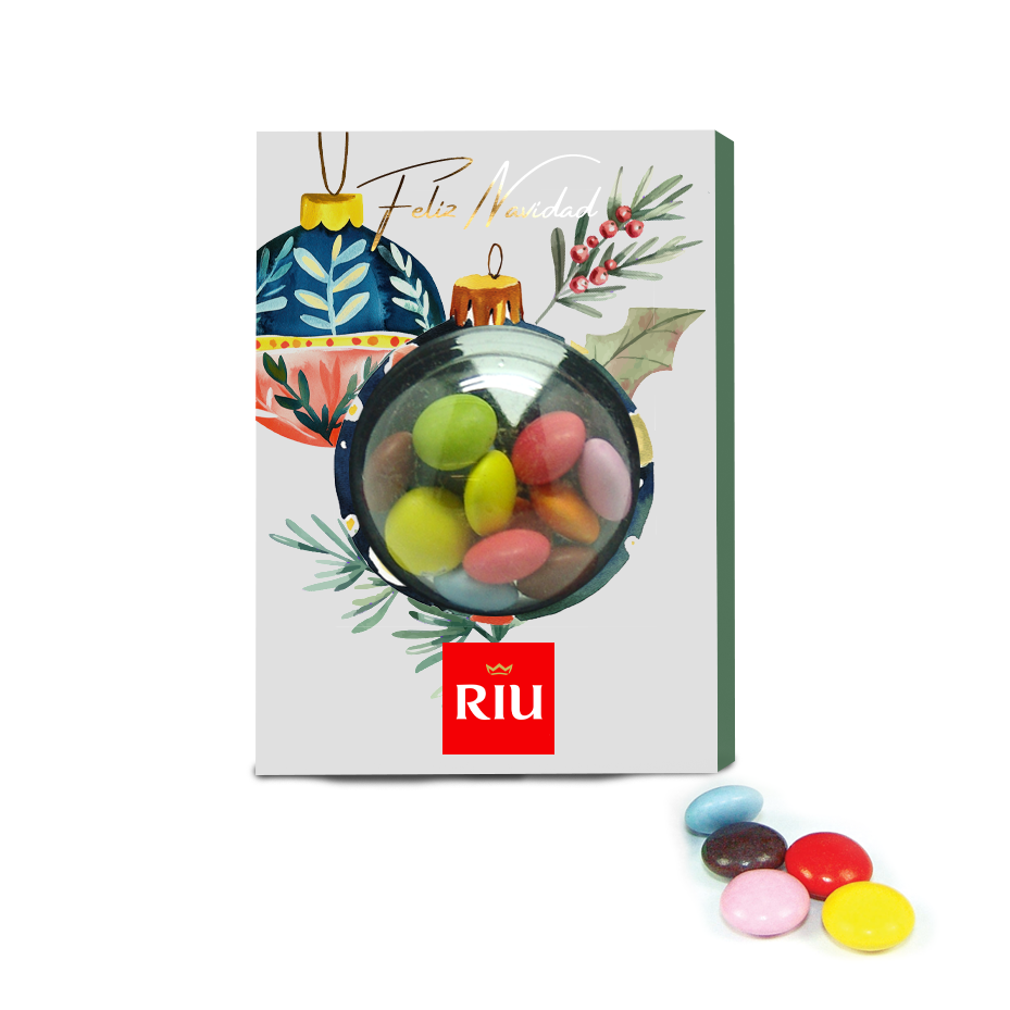 Description: sphere box (71.9×104.8×15 mm approx.) with jelly beans, balls or gum
