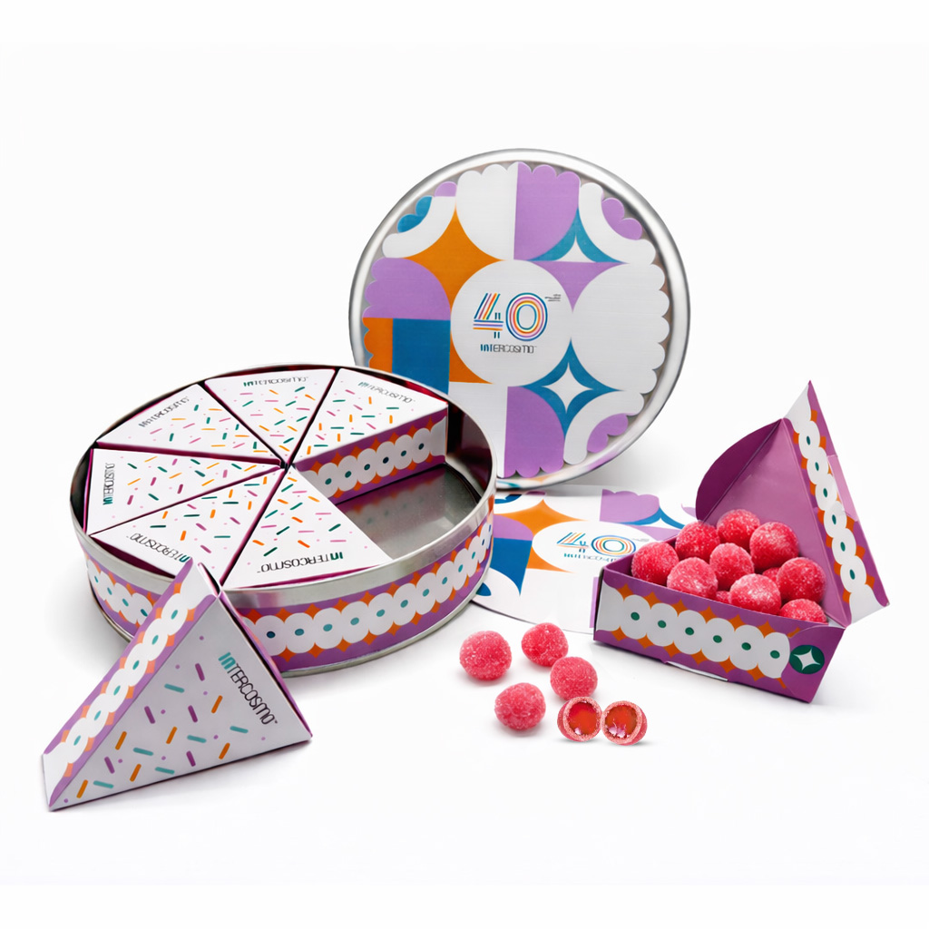 Description: Customized tin that transforms a corporate gift into an original and surprising experience. Inside, it contains 8 cake-slice–shaped boxes filled with chocolate-coated cereal balls, creating a different format that is visually appealing and easy to share.