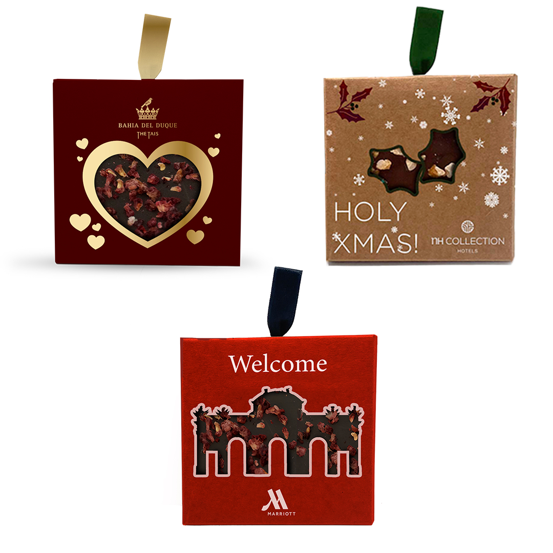 Description : boîte en carton (80x80x10 mm) avec fenêtre. Avec une tablette de 40g de chocolat artisanal avec toppings au choix.