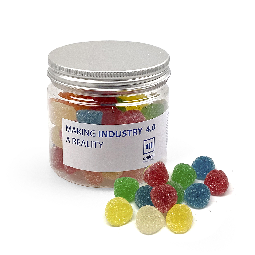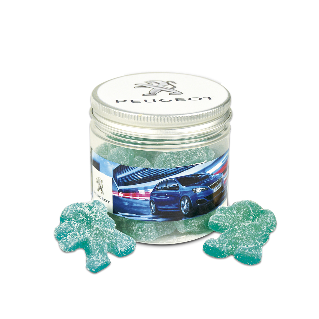 Description : pot (Ø70×60 mm) avec couvercle en métal ou PVC, avec des bonbons au choix.