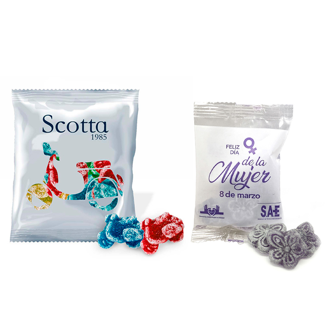 Personnalisation : sachet (125×165 mm environ) contenant 20g de bonbons durs ou autres friandises.