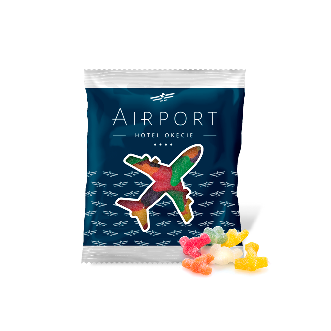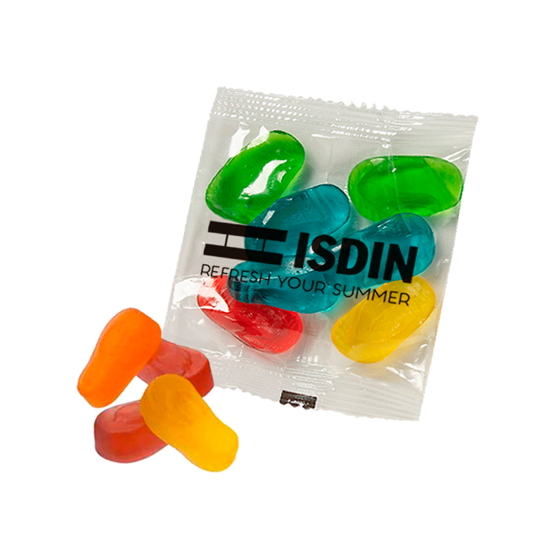 Description : Sachet (95×70 mm) de 10 g avec garniture standard (gouttes) ou votre bonbon gélifié en 3D. Possibilité de remplissage avec bonbons durs sur demande.