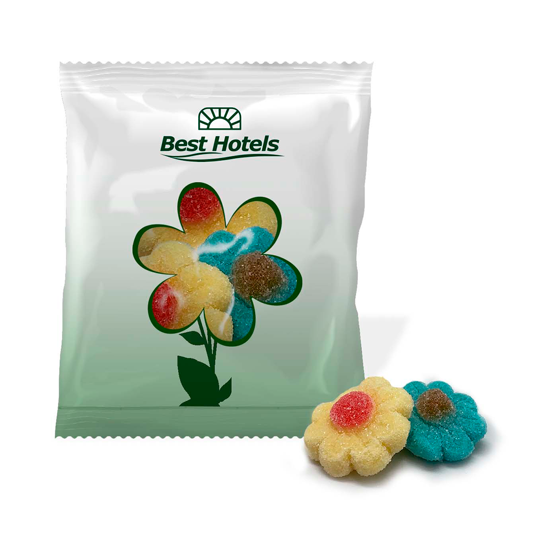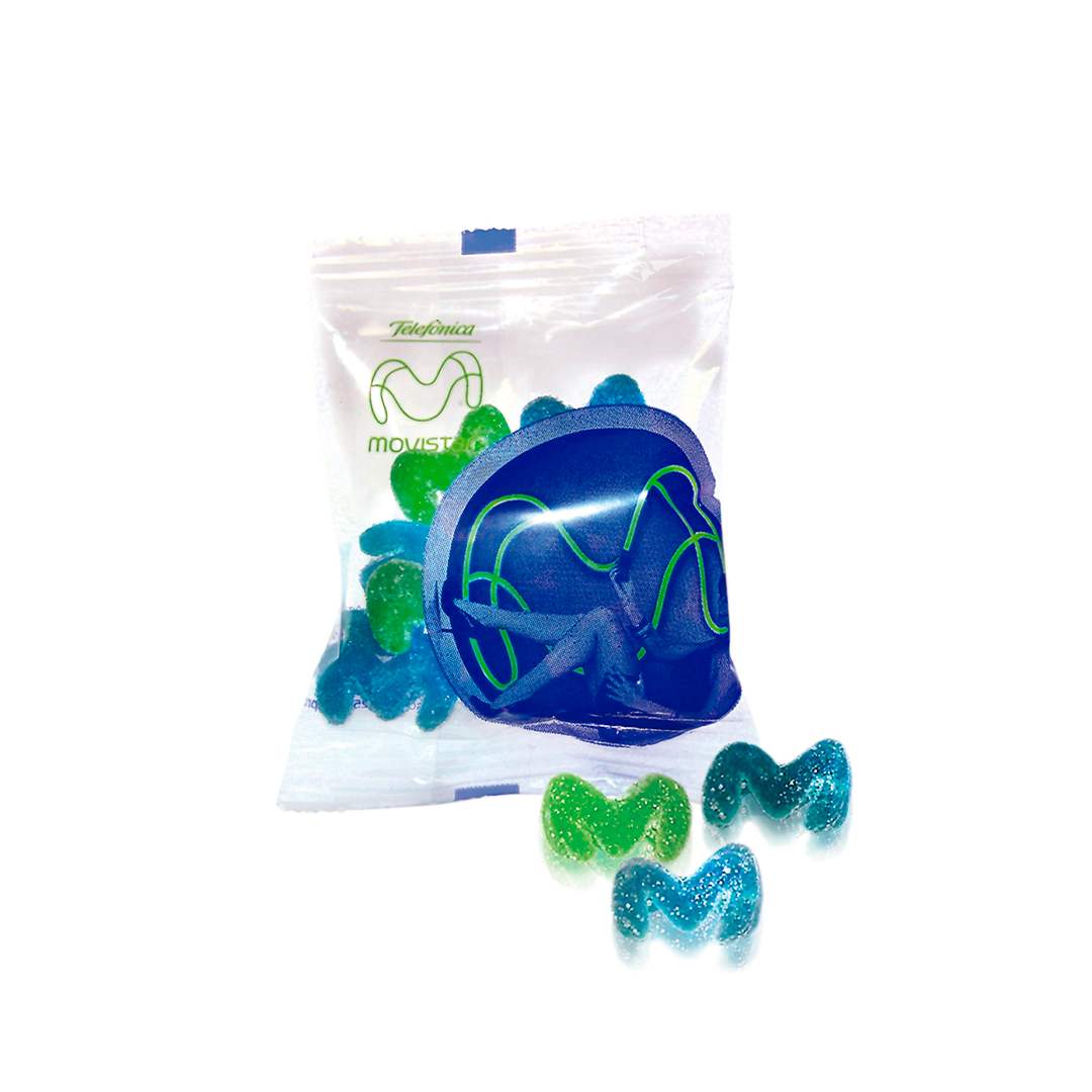Description : Sachet (95×70 mm) de 10 g avec garniture standard (gouttes) ou votre bonbon gélifié en 3D. Possibilité de remplissage avec bonbons durs sur demande.