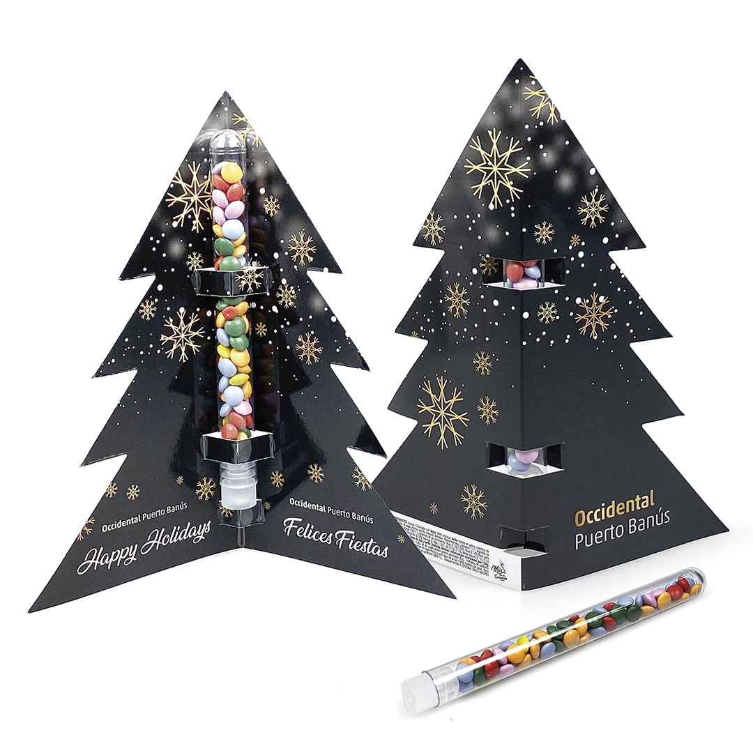 Descripción: díptico en forma de abeto con tubo de cristal relleno de grageas o bolas de chocolate.