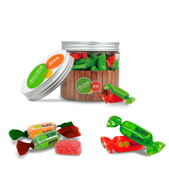Personalización: tapa y etiquetas del cuerpo personalizables de 1 a 4 colores. Posibilidad de personalizar caramelos según tu logo o idea. a consultar.