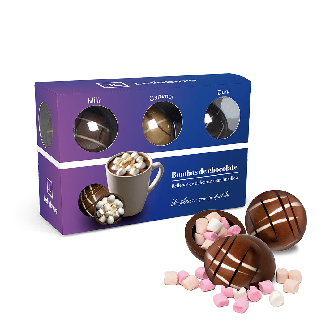 Descripción: caja con 3 bombas de chocolate de distintos sabores, rellenas de marshmallows para derretir en leche caliente.
