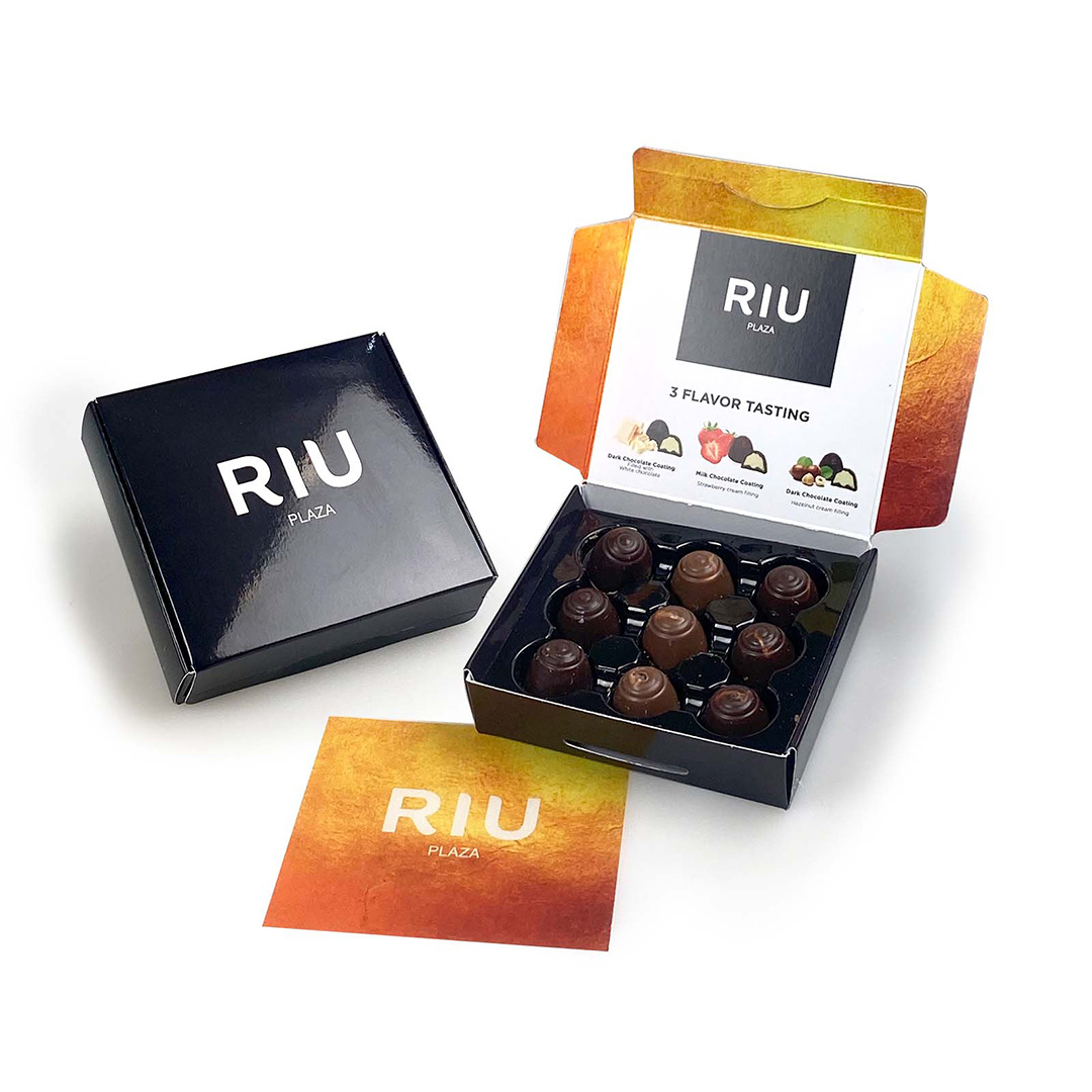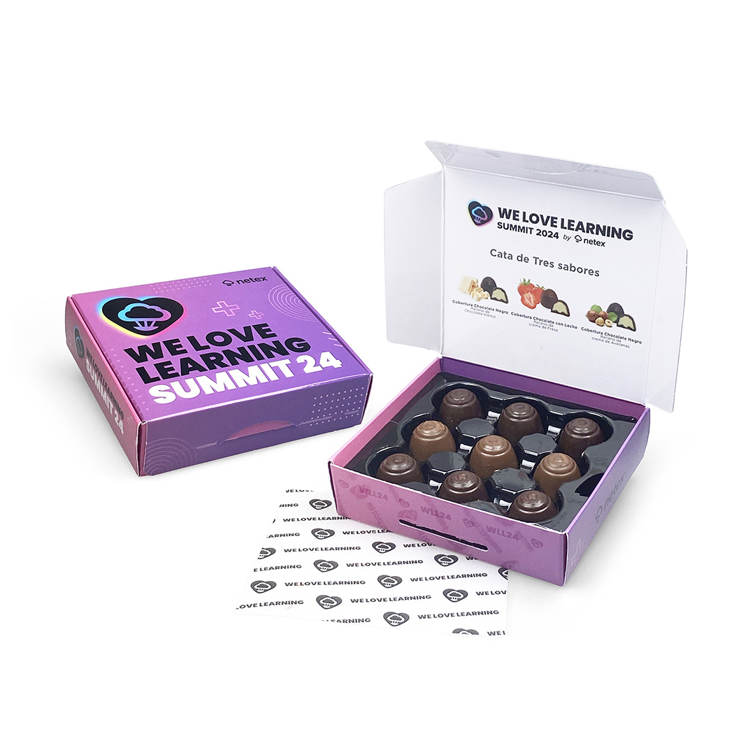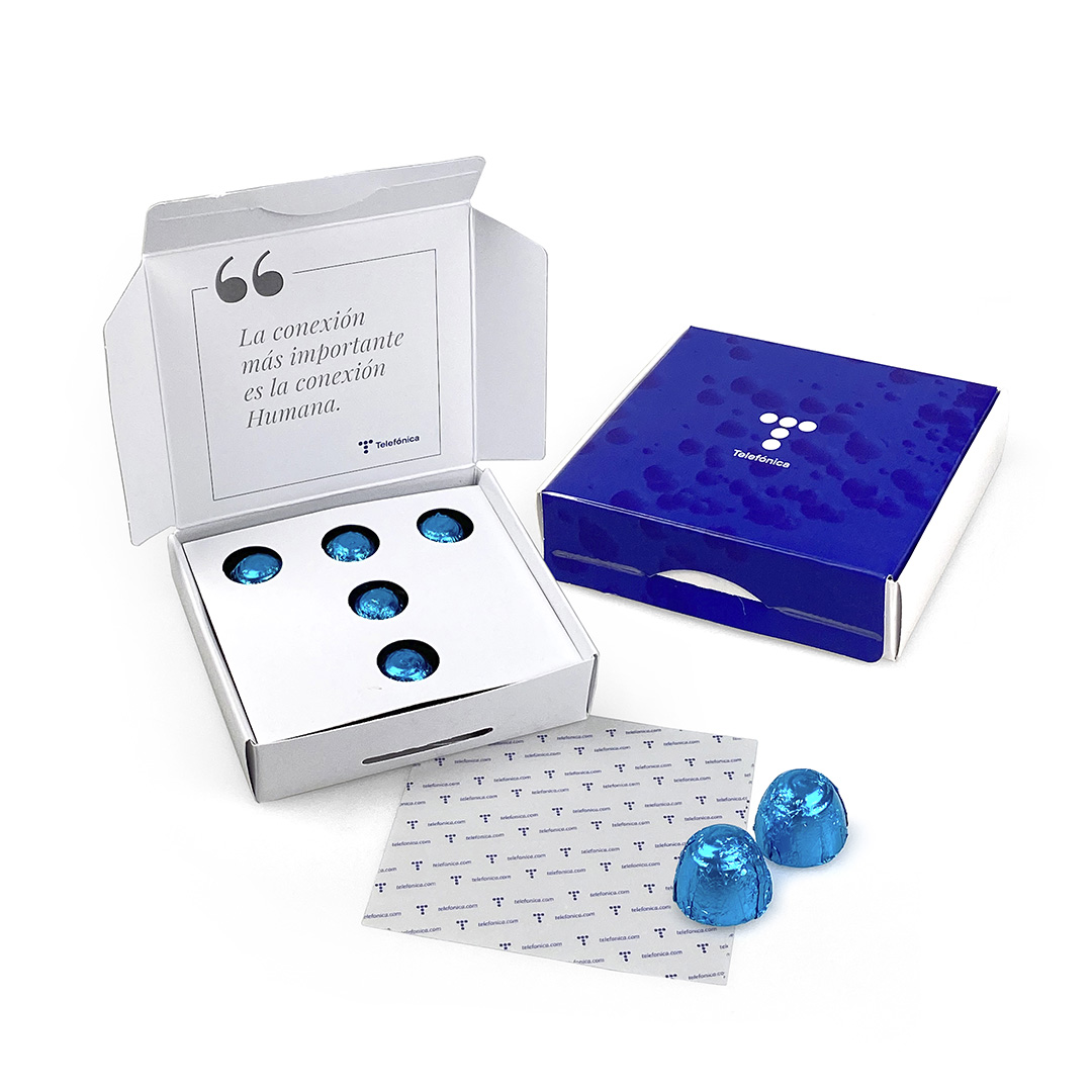 Descripción: caja de cartón folding con 9 mini bombones tesais de 3 sabores, un formato compacto que funciona como una auténtica herramienta de comunicación.