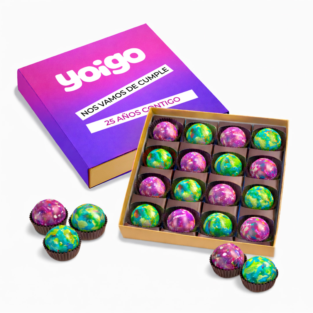 Disponible también en versión de bombones de colores, conservando la misma filosofía: responsable en su estructura, impecable en su contenido y perfectamente alineados con el branding de tu empresa.