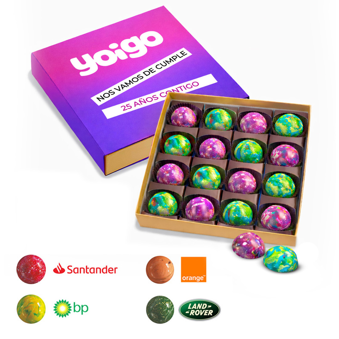El protagonismo del producto está en los bombones de colores estilo Picasso, que aportan un impacto visual inmediato y permiten adaptar los colores al branding de la marca, evento o campaña, reforzando la coherencia estética de la acción.