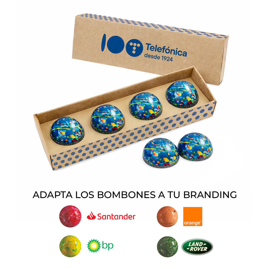 Descripción: caja con 4 trufas de chocolate belga, una propuesta que une sostenibilidad, imagen de marca y máxima calidad.