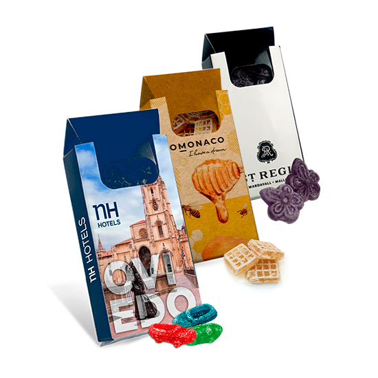 Descripción: caja dosificadora en folding o kraft (80x40x20 mm) con caramelos / chicles / caramelos miel / violetas / perlas. Otros rellenos a consultar.