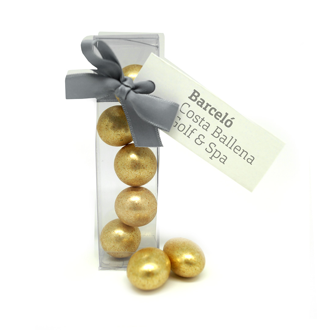 Descripción: caja de acetato transparente con 5 bolas de cereal recubiertas de chocolate, un formato que convierte el propio producto en protagonista.
