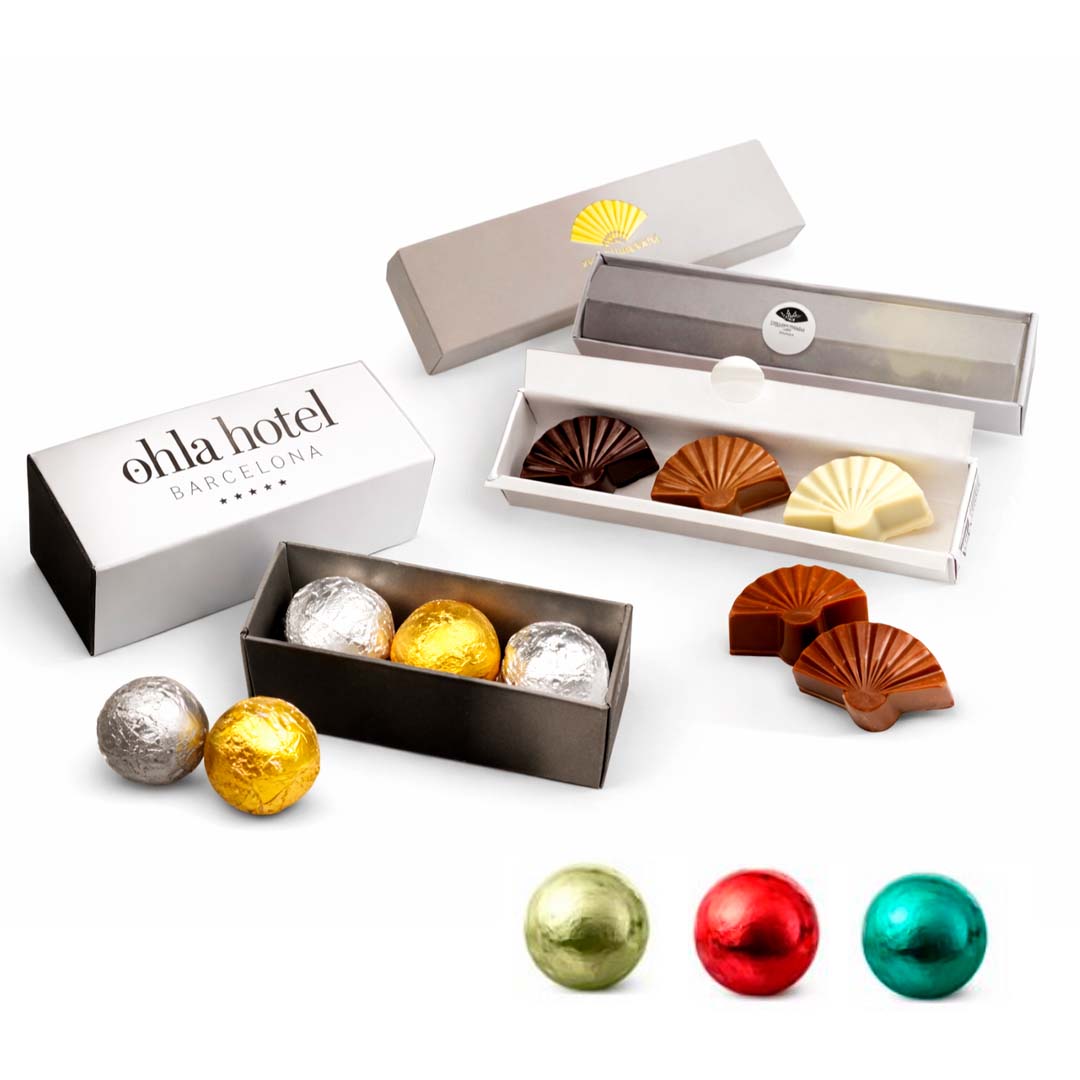 Los bombones ofrecen múltiples posibilidades: se puede elegir el color del aluminio para adaptarlo al branding, seleccionar bombones artesanos de alta calidad o incluso desarrollar bombones personalizados en 2D, reforzando la identidad visual directamente en el producto.