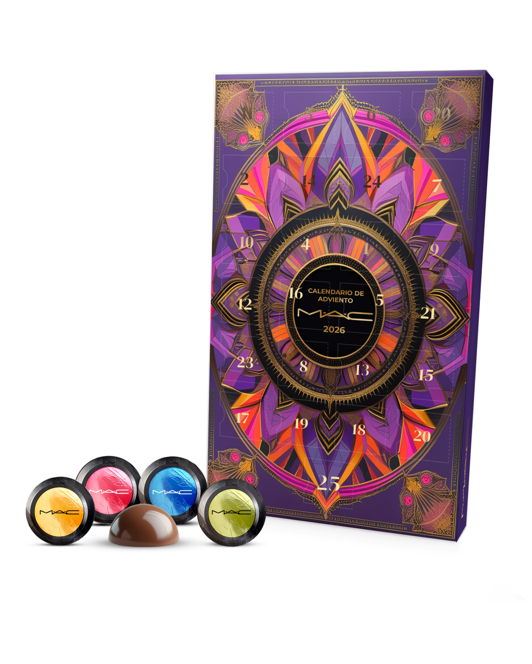 Descripción: calendario de cartón (332x190x20 mm) y 25 navifichas de chocolate en papel de aluminio.