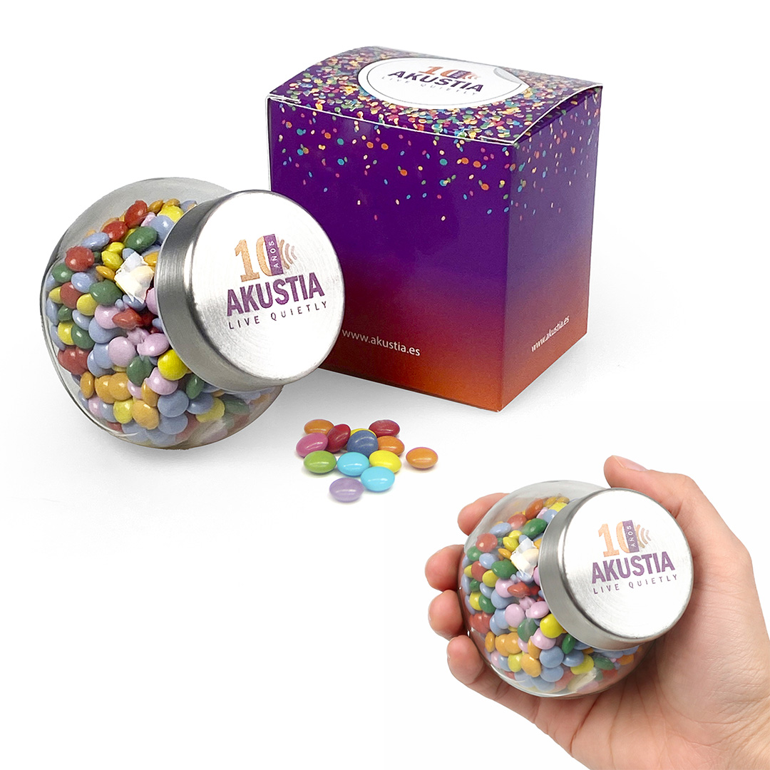 Descripción: mini caramelera de cristal con tapa de acero, rellena con 40g de surtido de chocolates premium de altísima calidad. Un formato elegante y atemporal donde el propio material aporta valor percibido, peso y sofisticación al detalle.
