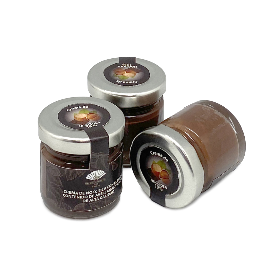 Descripción: tarritos de de cristal con tapa metálica rellenos de 40g aprox de crema de Nocciola 19 % o Mantequilla de cacahuetes 96 %.