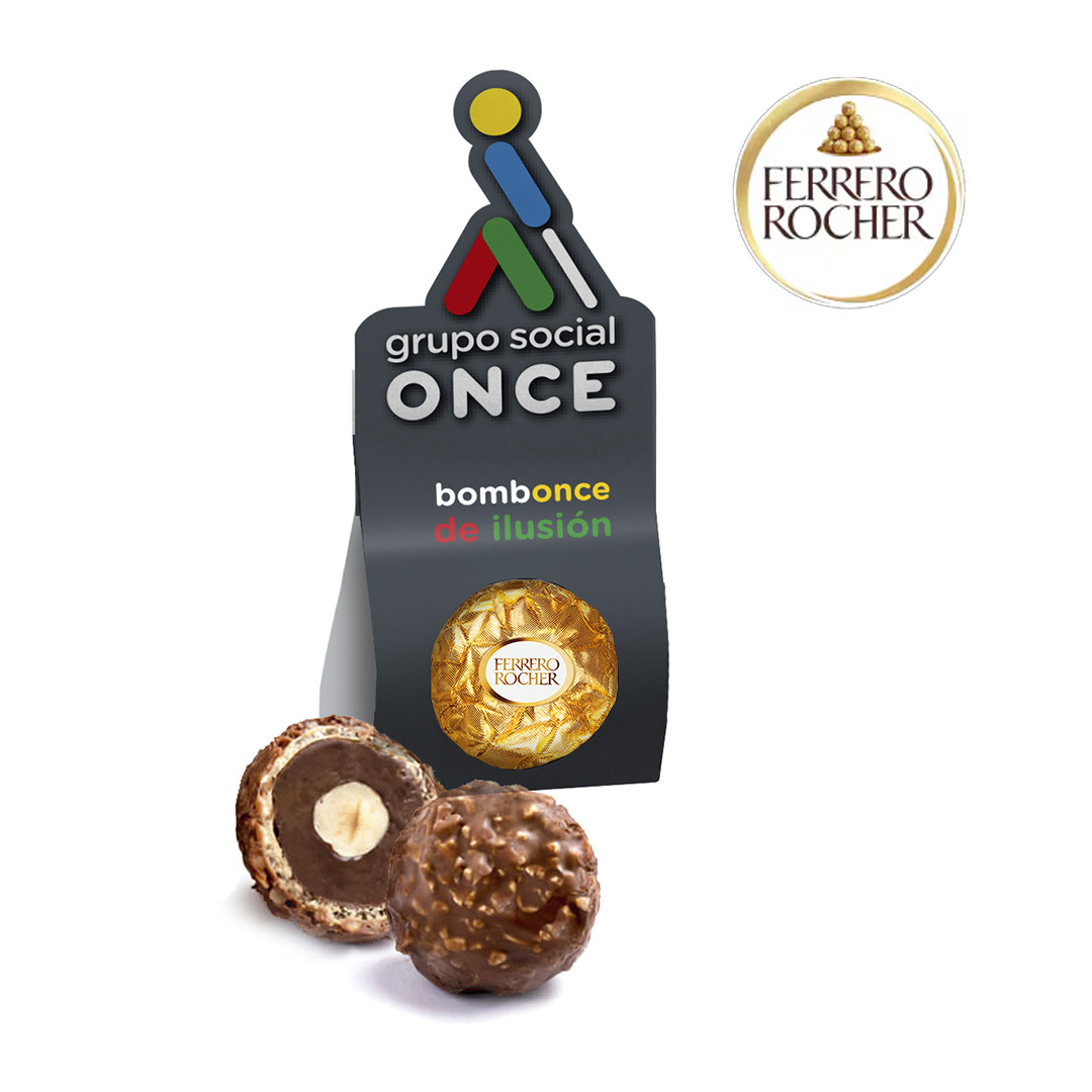 Descripción: bombón Ferrero Rocher®, elaborado con avellanas tostadas bañadas en suave crema de chocolate y envueltas en un crujiente barquillo con trozos de avellana, una combinación reconocida por su textura y equilibrio de sabores.