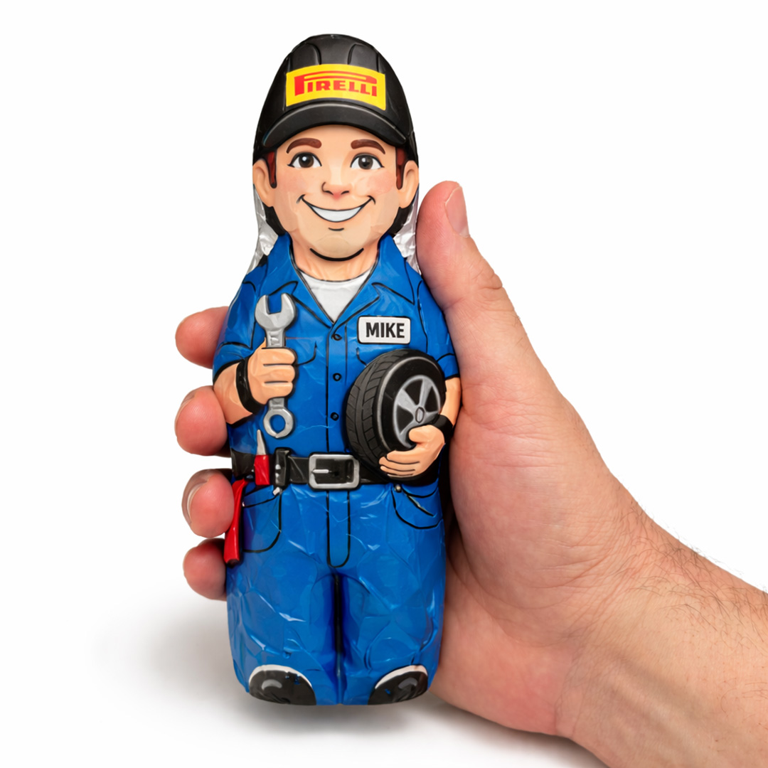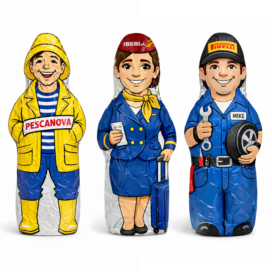 Descripción: figura de chocolate hueca de 100 g, elaborada con chocolate de excelente calidad y pensada para acciones promocionales, campañas estacionales o detalles corporativos con un enfoque creativo.