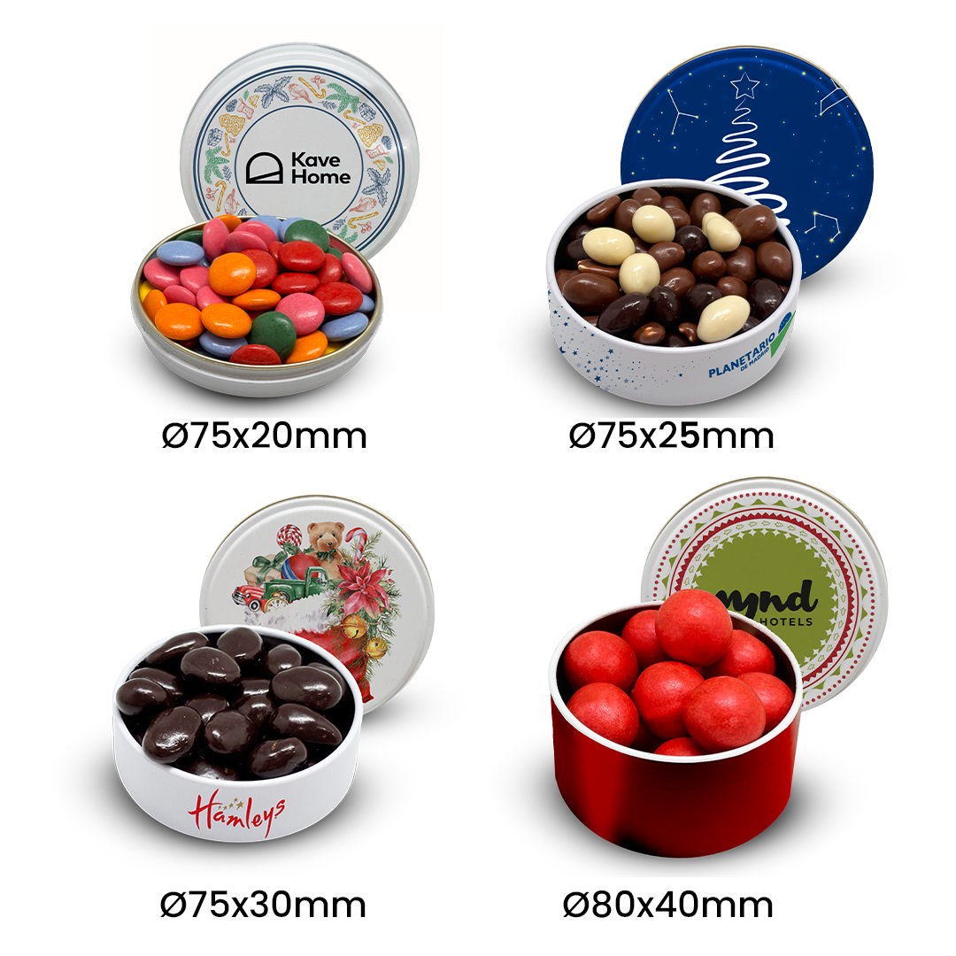 Descripción: latas de 70 Ømm de acero con chocolates premium. Consultar la posibilidad de otros rellenos.