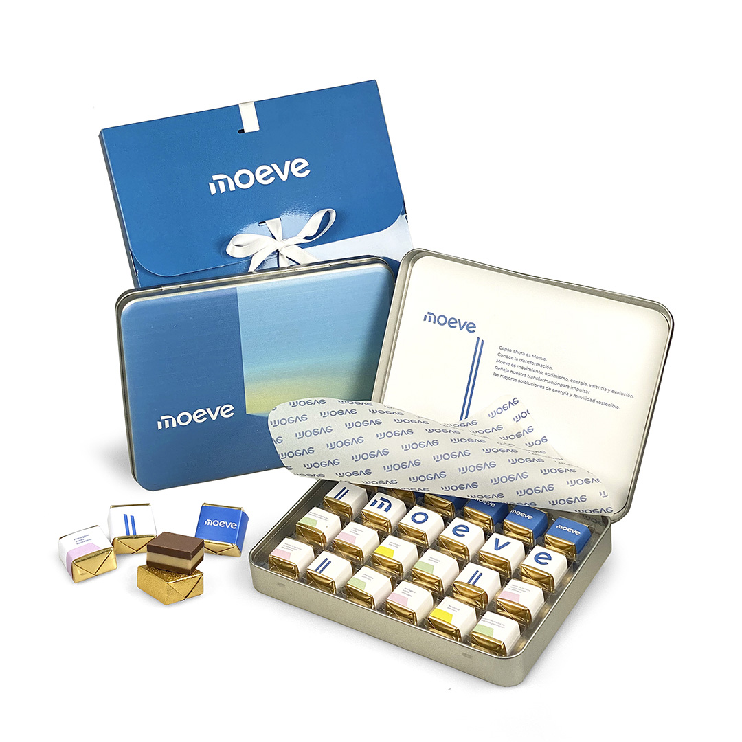 Descripción: lata de acero con 24 creminos, creada como un regalo corporativo premium totalmente personalizable. Un formato elegante y duradero, pensado para compartir y para convertirse en un soporte de comunicación de marca.