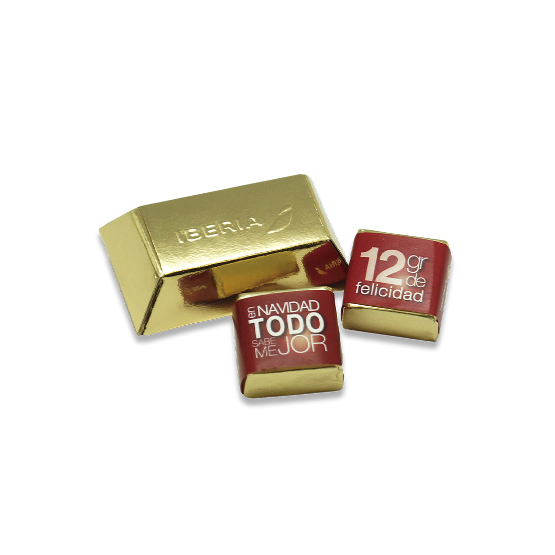Descripción: lingote pequeño acabado en oro metalizado, que contiene dos cortados de chocolate 100 % avellana. Un formato compacto que transmite valor, solidez y exclusividad desde el primer vistazo.