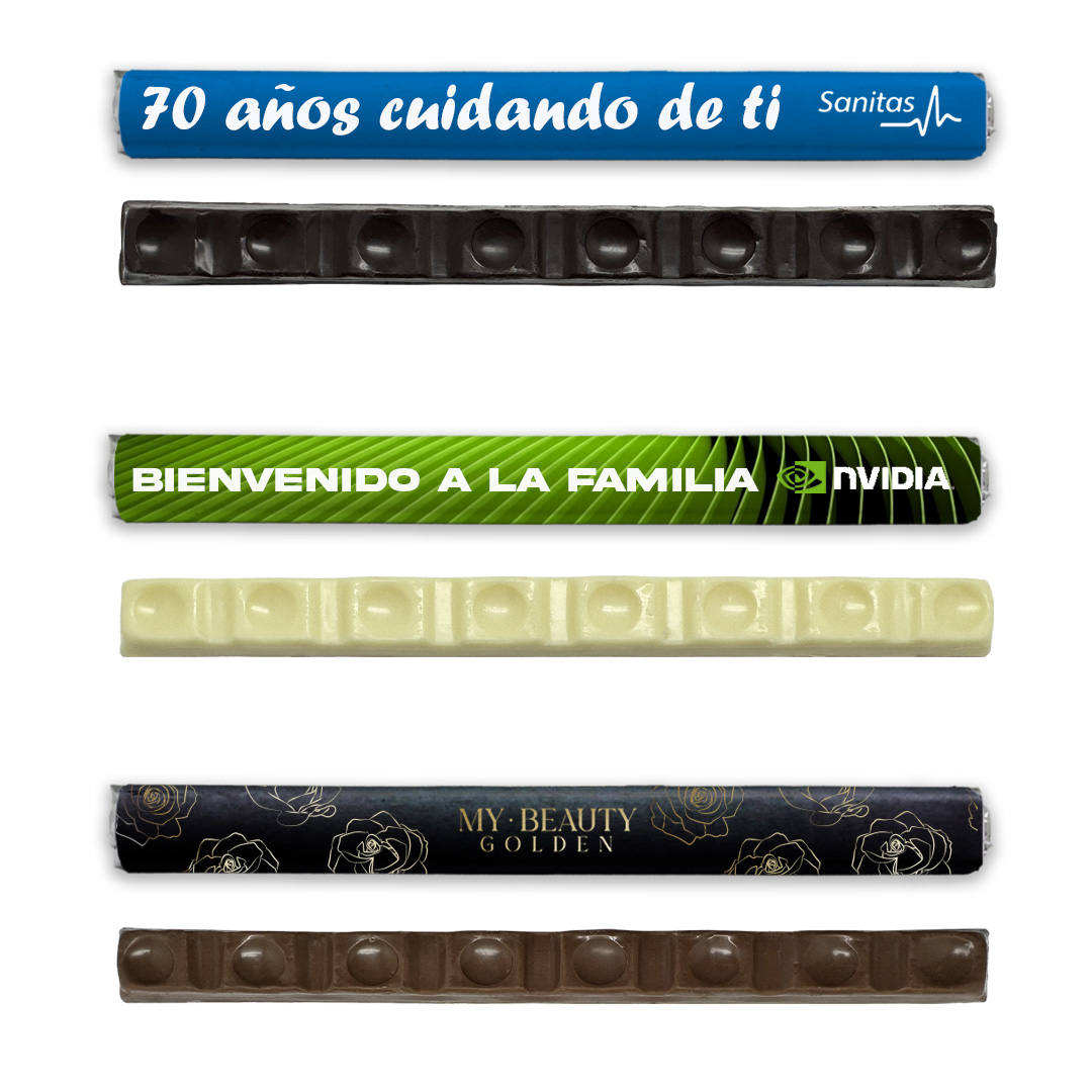 Su principal valor es el formato alargado, que permite crear mensajes, claims o titulares directamente sobre el propio producto, convirtiendo el chocolate en un soporte creativo y no solo en un detalle dulce.