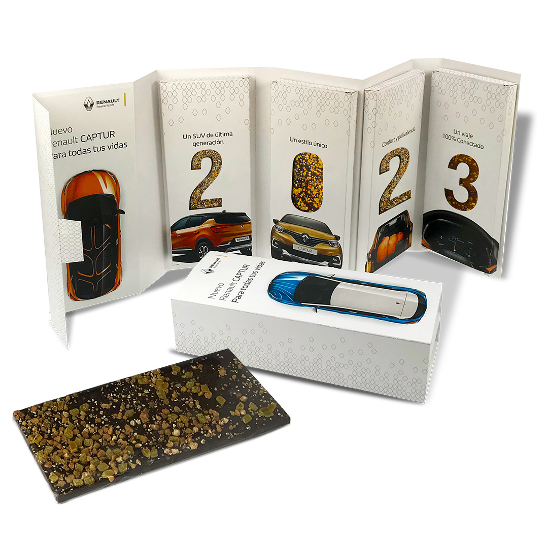 Descripción: desplegable de tamaño A4 con 4 tabletas de chocolate de 80g con topping.