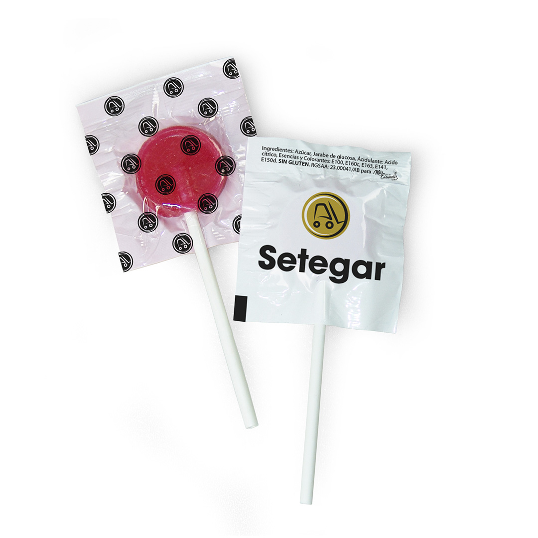 Personalización: de 1 a 4 colores sobre papel blanco o transparente.-Cara A fotocentrada, cara B impresa en continuo.-Sabores: estándar de cereza. Posibilidad de elegir otros sabores: manzana, fresa, limón, naranja, cola y menta.