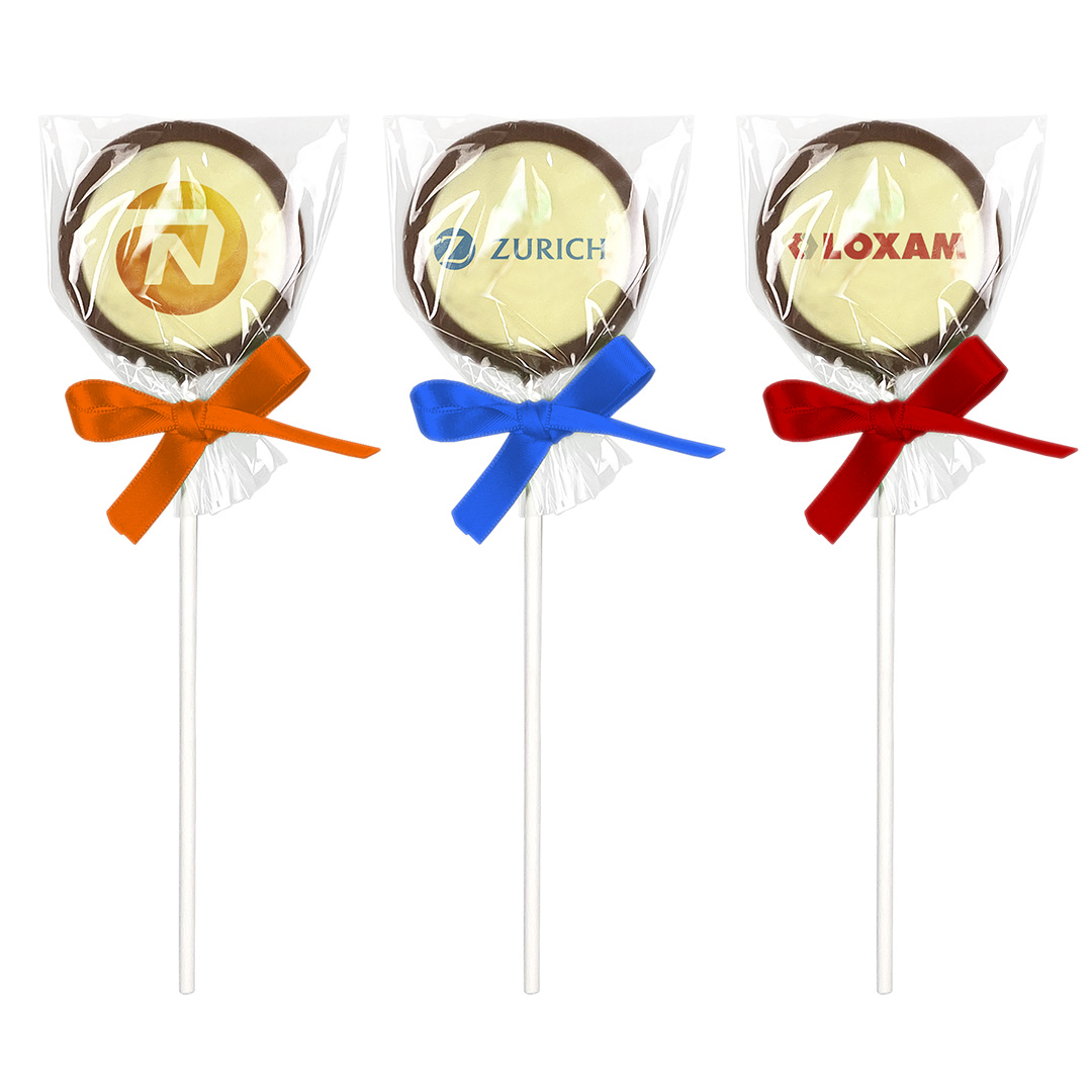 Personalización: piruleta de chocolate personalizable mediante impresión con el color de tu idea. Chocolate, banderola y cartela personalizables de 1 a 4 colores.