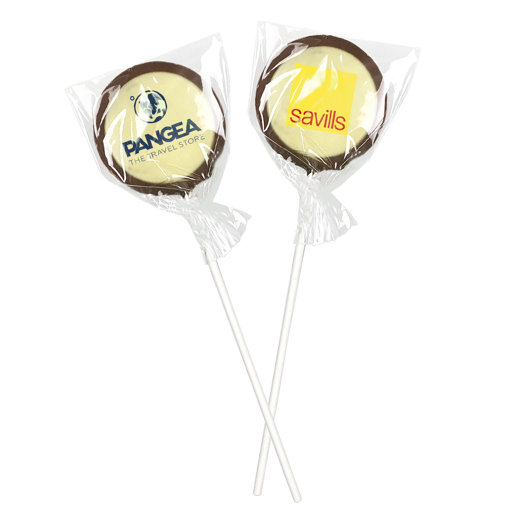 Descripción: piruleta de chocolate redonda 2D disponible en 60 g, 40 g o 20 g aprox., impresa sobre el propio chocolate con los colores que tú quieras.