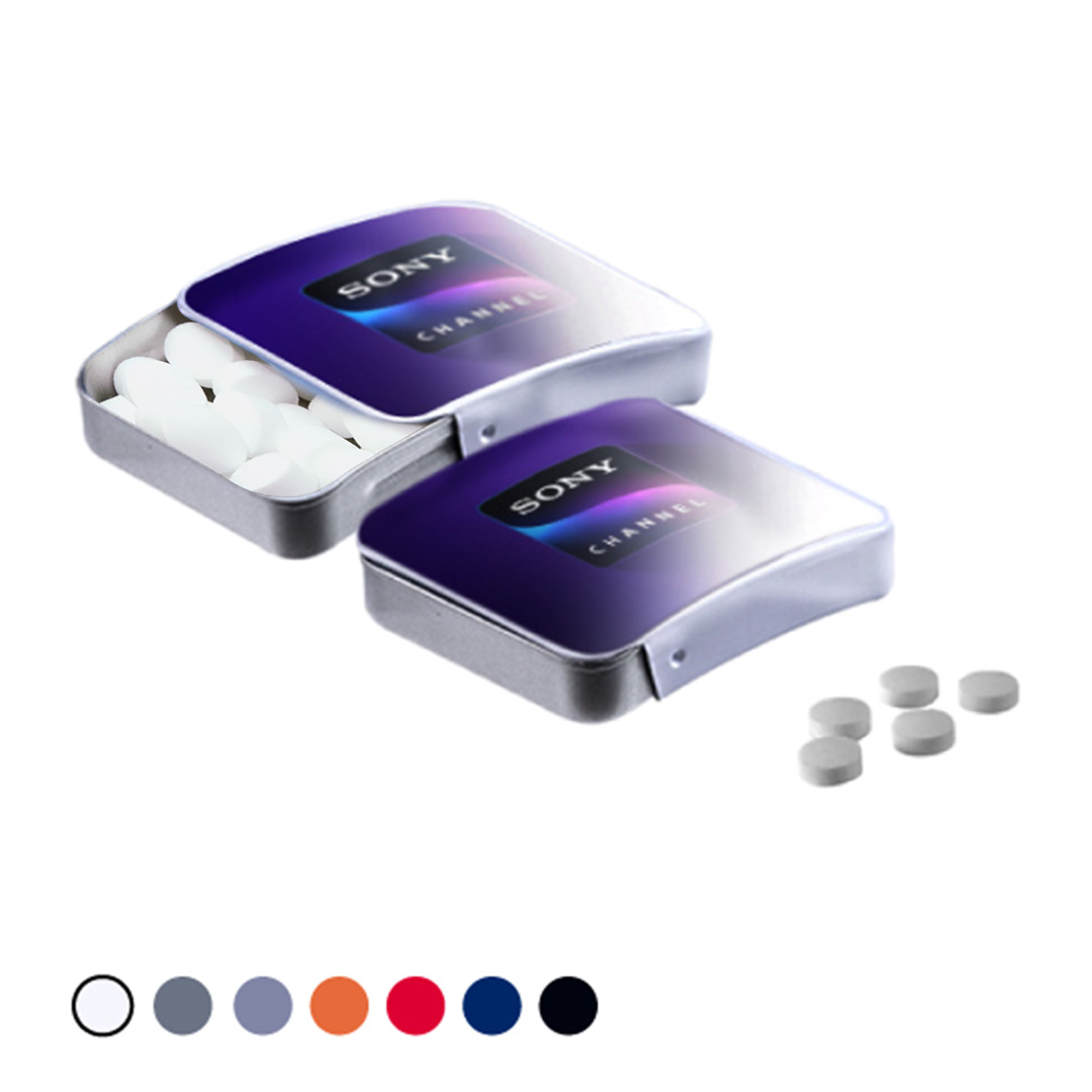 Descripción: lata deslizante con 15g aprox de mini mentas. Disponible en varios colores (a consultar).