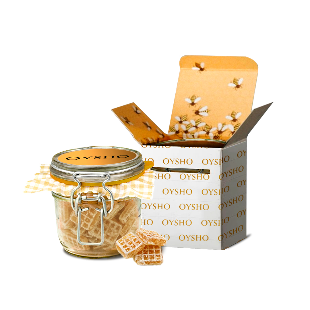 Descripción: bote de cristal con cierre de presilla, disponible en formatos de 80 a 200 ml, relleno con caramelos artesanos de miel y limón, un detalle elegante que combina calidad de producto y alta percepción de valor.